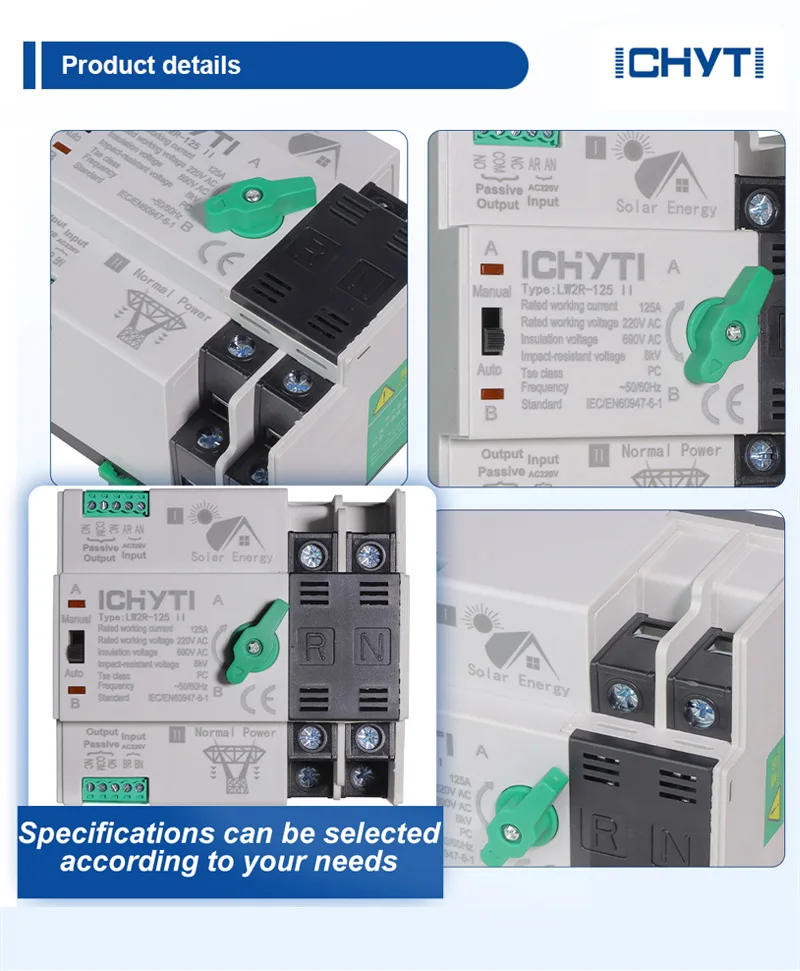 China Factory ICHYTI 100a ats omkoblingsbryter Made in China er en enhet som brukes i nødstrømforsyningssystemer, egnet for nominelle spenninger som ikke overstiger 1000V AC eller 1500V DC. Hovedfunksjonen er å avbryte strømforsyningen til lasten under kraftkonverteringsprosessen.