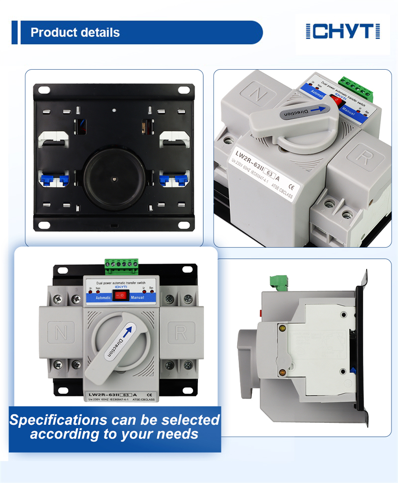 China Factory ICHYTI automatisk generatoromkoblingsbryter på lager er å automatisk bytte til en reservestrømkilde i tilfelle plutselig strømbrudd, for å sikre normal drift av viktige steder. Mye brukt i høyhus, boligområder, sykehus, flyplasser, brygger, brannslukking, metallurgi, kjemikalier, tekstiler og andre steder hvor strømbrudd ikke er tillatt. Vanlige applikasjonsscenarier inkluderer heiser, brannbeskyttelse og overvåking, og banker bruker også lignende avbruddsfri strømforsyning. Automatisk generatoromkoblingsbryter kan også oppnå automatisk veksling av overspenning, underspenning og fasetap, og har intelligent alarmfunksjon.