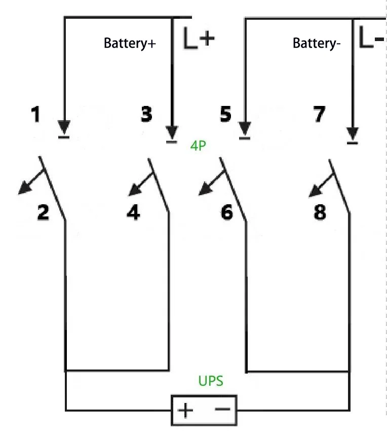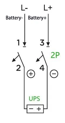 C:For eksempel: For en UPS med en kapasitet på 40 kVA og en nominell batteristreng på 40 celler (utjevnende ladespenning: 14 V × 40 = 560 V), beregnes maksimal driftsstrøm som 40 kVA × 1,0 ÷ 90 % ÷ 10 V ÷ 40 A = 111 A kan brytes A 5P 50 krets. vedtatt, med to av polene koblet i serie. Kablingsmetoden er som følger: